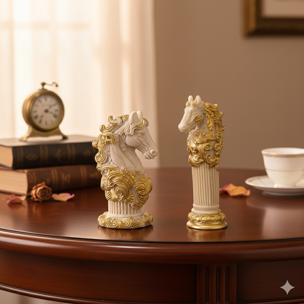 Duo de Statuettes Chevaux « Héritage » – Élégance Blanc & Or