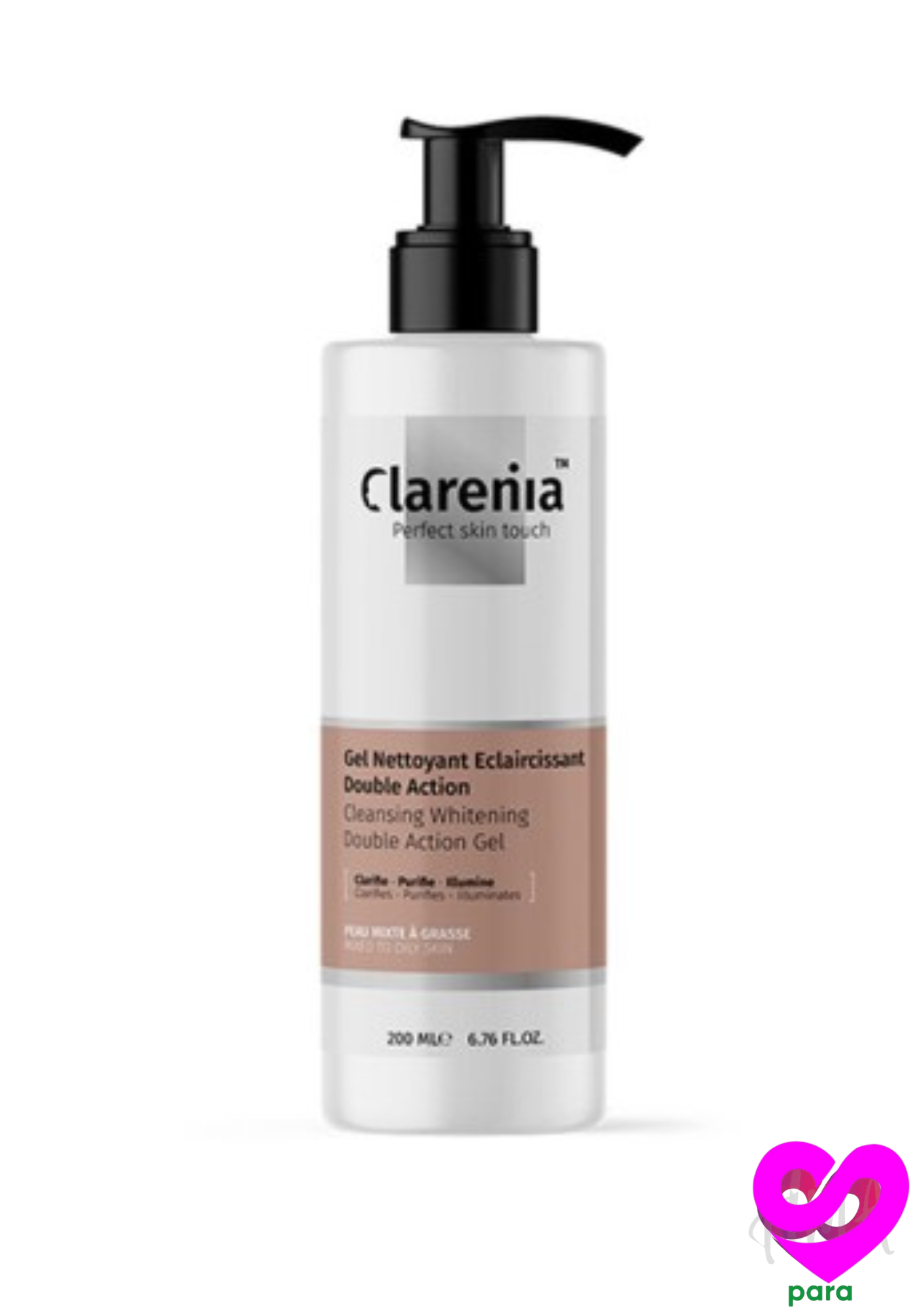 Clarenia Gel Nettoyant Éclaircissant Double Action PMG: Élimine impuretés et sébum tout en corrigant les troubles de pigmentation. Formule naturelle pour une peau fraîche, douce et un teint unifié.